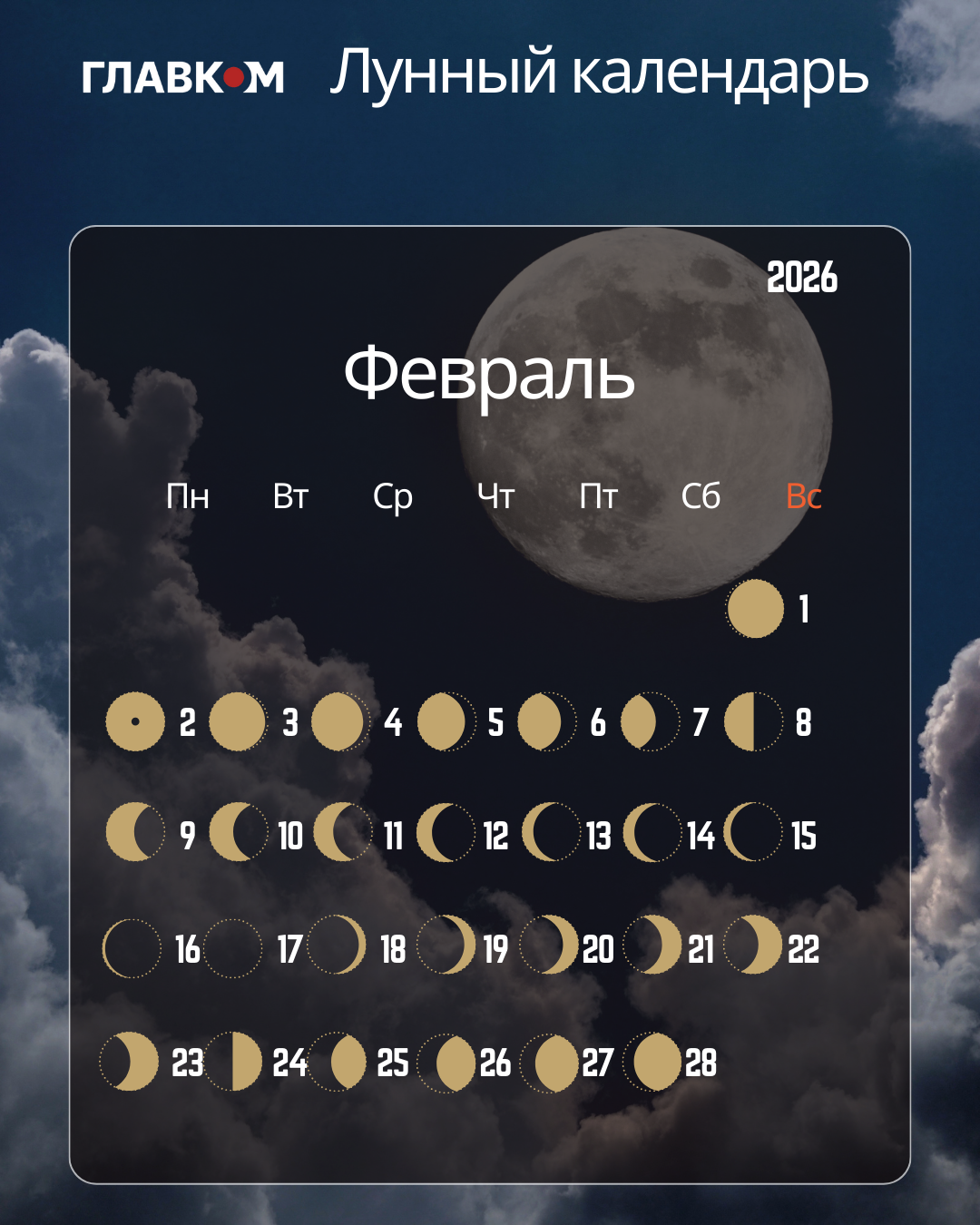 В феврале 2026 года лунный цикл будет иметь следующую структуру: