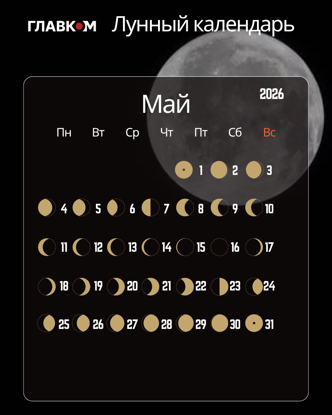 В мае 2026 года лунный цикл будет иметь следующую структуру: