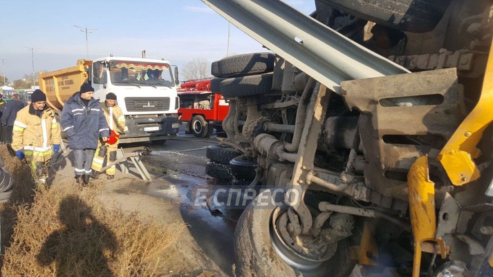 Масштабное ДТП в Киеве: грузовик перевернулся, маршрутка разбита
