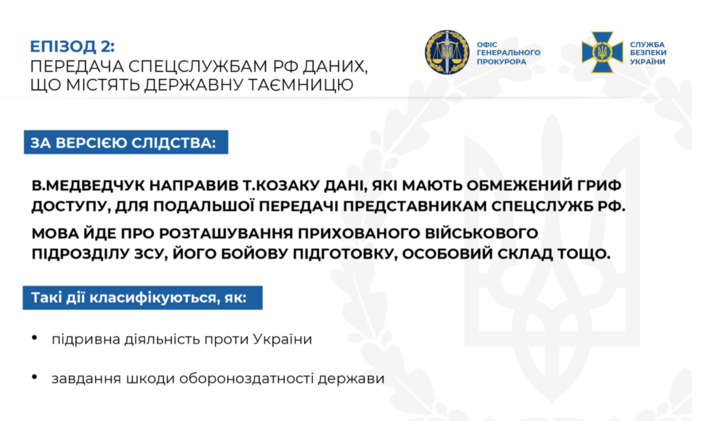Глава СБУ Иван Баканов обнародовал информацию о втором подозрении Медведчуку и Козаку. Их обвиняют в том, что Виктор Медведчук передавал Тарасу Козаку секретную информацию о расположении военного подразделения ВСУ. Кроме того, Медведчук и Козак готовили проект «Луч». Это план формирования сети агентов влияния из России для подрывной деятельности в Украине.