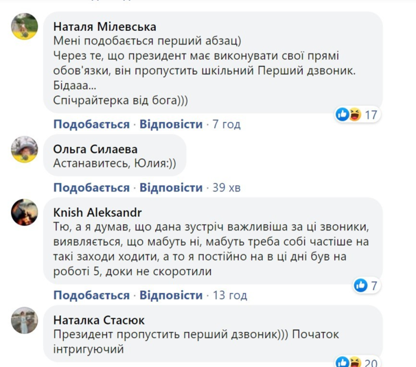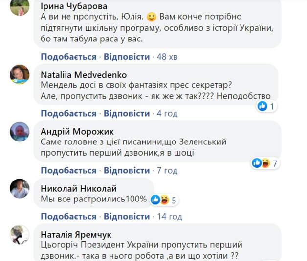 «Из-за того, что президент должен выполнять свои прямые обязанности, он пропустит школьный первый звонок...», «Тю, а я думал, что данная встреча важнее этих звонков, оказывается, что нет...», «Самое главное из этой писанины, что Зеленский пропустит первый звонок, я в шоке», – пишут пользователи соцсети под постом бывшего пресс-секретаря.