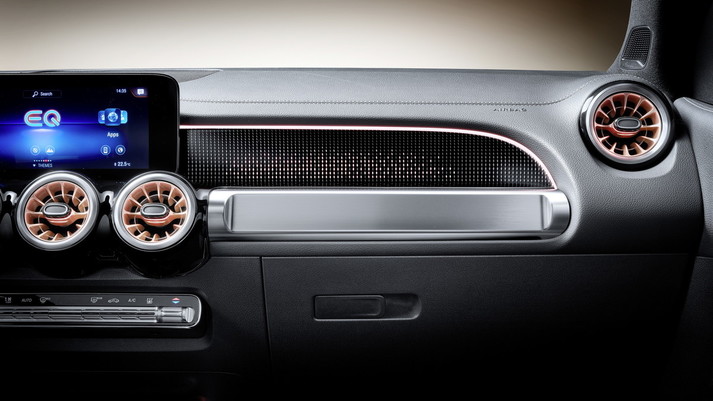 Внутри отличия между EQB и GLB минимальны: у электромобиля свой скин приборной панели и иной интерфейс медиасистемы MBUX. Ещё один маркер «батарейной» силовой установки – бронзовый декор.