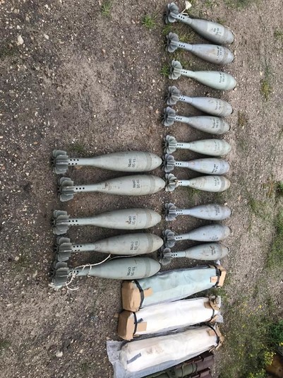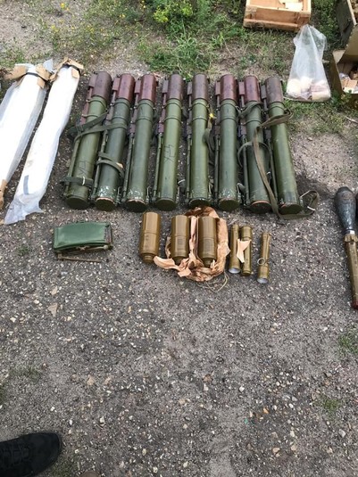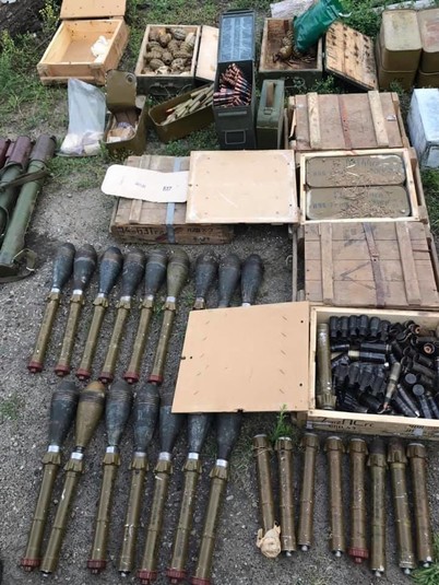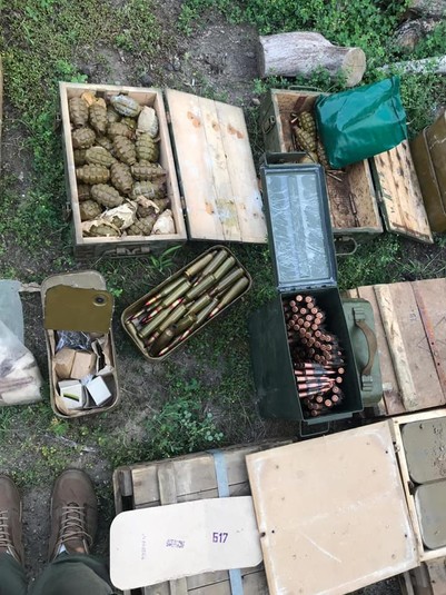 В пресс-центре СБ Украины отметили, что «во время санкционированных следственных действий правоохранители изъяли из тайника 16 минометных мин ОФ-36 калибра 120 мм, которые запрещены минского соглашениями, 11 ручных противотанковых гранатометов РПГ-22, 3 ручные кумулятивные гранаты РКГ-37, 66 гранат ВОГ-17 к автоматическому гранатомету, противопехотную направленную мину МОН-50, 44 гранаты Ф-1 и РГД-5, 12 ящиков с патронами различного калибра, заряды к минам, взрыватели и самодельные взрывные устройства».