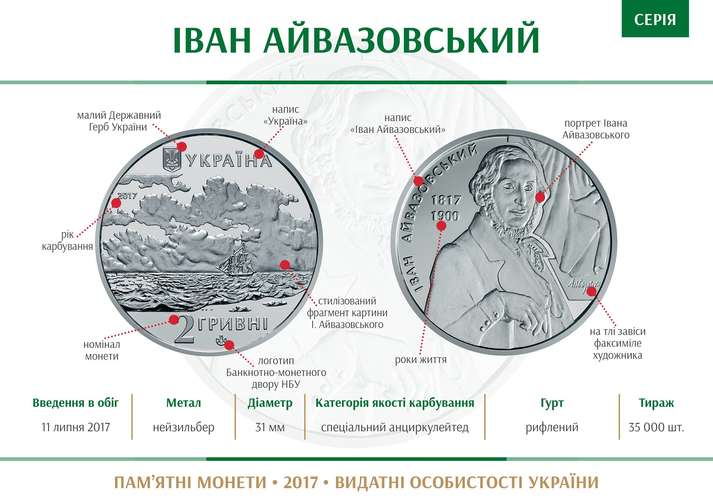 Вторая монета, которая пополнила серию «Выдающиеся личности Украины», посвящена Ивану Айвазовскому. Ее стоимость составляет 35 грн. Тираж монеты – 35 тыс. штук, она изготовлена из нейзильбера.