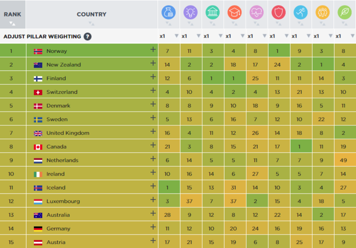 Всего в рейтинг вошли 146 стран. Они оцениваются по девяти критериям: развитие экономики, состояние бизнес-среды, эффективность государственного управления, доступ к образованию, уровень здоровья граждан, безопасность, уровень личной свободы, социальный капитал жителей и экология.