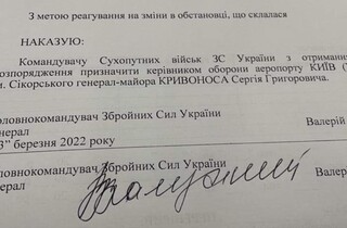 «25 февраля, сразу после нападения, я заключил, что противник после Гостомеля может выбросить десант непосредственно в Киев, в аэропорт «Жуляны», и выехал туда ознакомиться с обстановкой. Я увидел, что в «Жулянах» на тот момент отсутствовали какие-либо руководители, отвечающие за оборону стратегического объекта, и средства обороны отсутствовали. Я позвонил оттуда главнокомандующему ВСУ Залужному, сообщил обстановку и получил устный приказ взять под командование оборону аэропорта», – добавляет Кривонос.