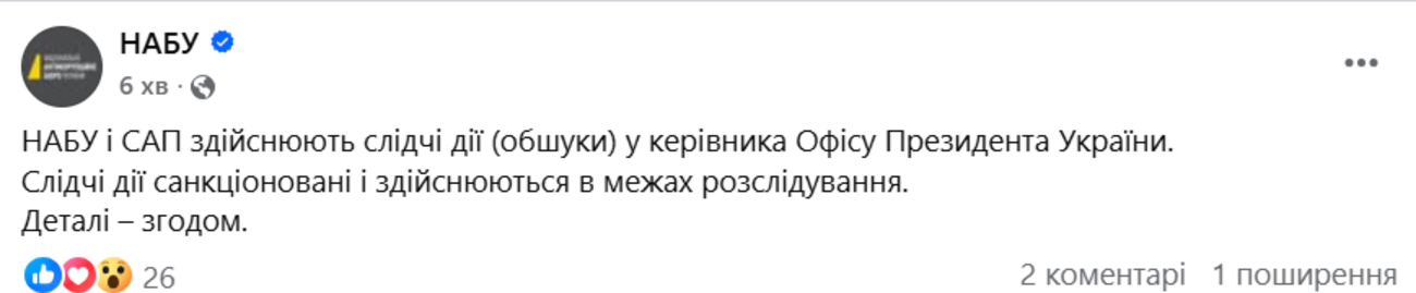 НАБУ: Следственные действия санкционированы и осуществляются в рамках расследования
