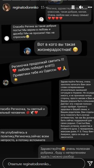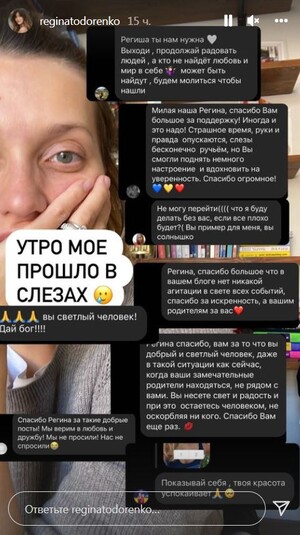 Сегодня в сторис своей соцсети Регина опубликовала отзывы российских читателей ее блога, которые благодарят, что она «несет позитив, несмотря на то, что ее родители сейчас не рядом», а также просят «не углубляться в политику». Наверное, таким способом Тодоренко уговаривает себя, что все делает правильно.