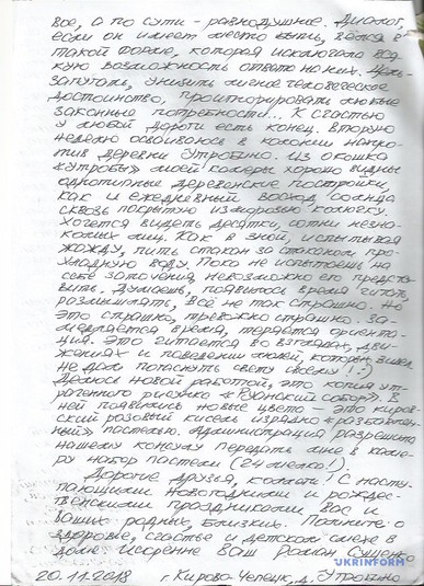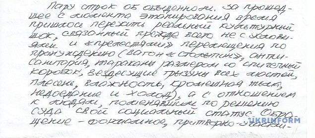 «Пару строк об обыденном. За прошедшее с момента этапирования время пришлось пережить культурный шок, связанный, прежде всего, не с условиями и «прелестями» перемещения по принуждению (вагон «столыпин», антисанитария, тараканы размером со спичечный коробок, вездесущие грызуны всех мастей, плесень, влажность, кромешная тьма, недоедание и холод), а с отношением к людям, поменявшим по решению суда свой социальный статус», - пишет Сущенко.