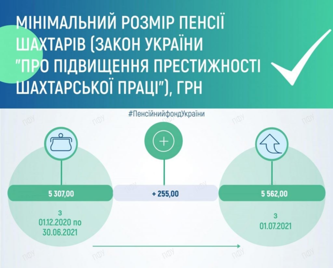 Минимальная пенсия шахтерам выросла на 255 гривен – 5 307 до 5 562 гривен. Минимальная пенсия семьям военнослужащих в случае потери кормильца выросла на 170 гривен – 3 538 до 3 708 гривен.