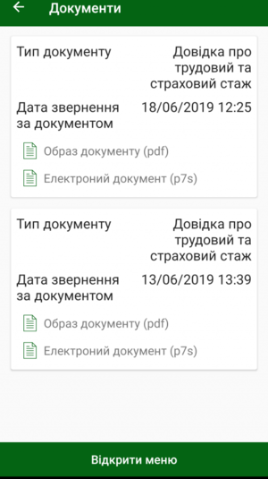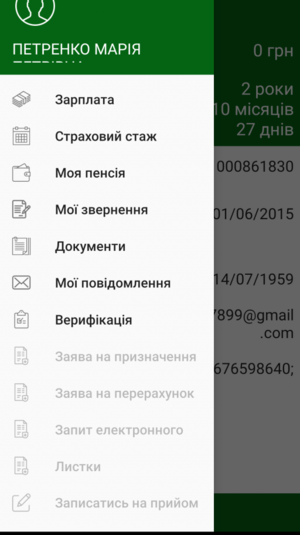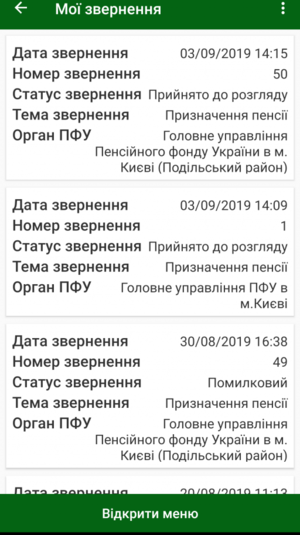 - Для всех категорий: просмотр состояния обработки обращений в Пенсионный фонд Украины, в том числе прикрепленных к обращениям документов; верификация документов, справок, сформированных в личном электронном кабинете; получение и просмотр сообщений от Пенсионного фонда Украины.