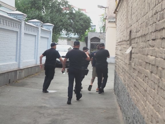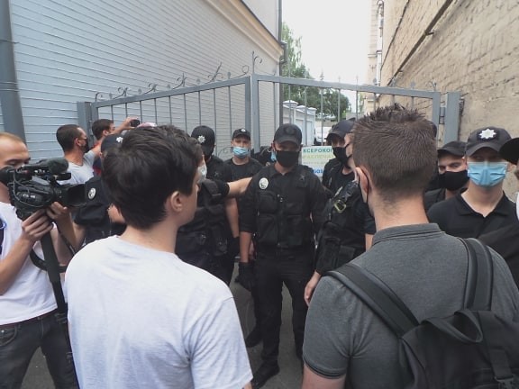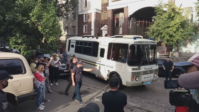 Люди пытались отбить задержанных у силовиков, произошла схватка, полицейской машине оторвали номера. Транспорт заблокировали собравшиеся под посольством.