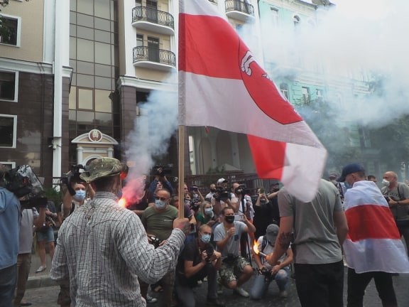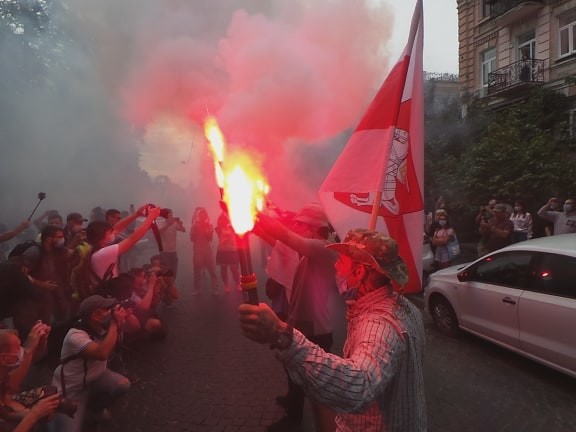 Митингующие под посольством Беларуси в Киеве зажгли фаеры, там проходит акция «Жыве Беларусь!» Около 30 активистов скандируют: «Верим, можем, победим!» и другие патриотические лозунги.