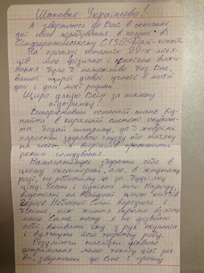 «Я обращаюсь к Вам в последние дни своего пребывания в плену в Симферопольском СИЗО... Использовав последний шанс найти в карательной системе оккупанта хотя бы щелочку, где бы были видны ростки здравого смысла или намека на честь, я решил прекратить режим голодовки», - написал Балух.
