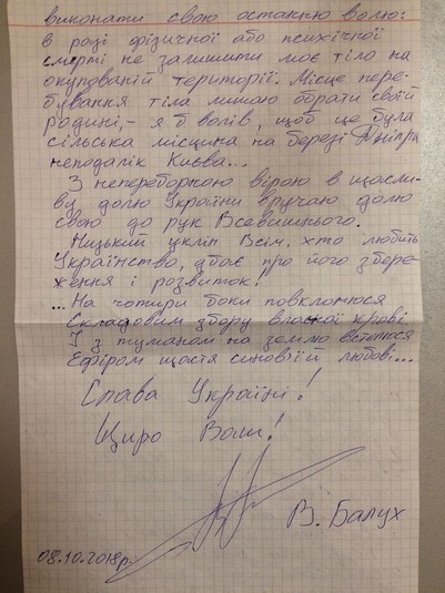 Он также добавил, что «в случае физической или психической смерти прошу не оставлять мое тело на оккупированной территории. Место нахождения тела оставляю выбрать своей семье, - я бы хотел, чтобы это была сельская местность на берегу Днепра под Киевом...»