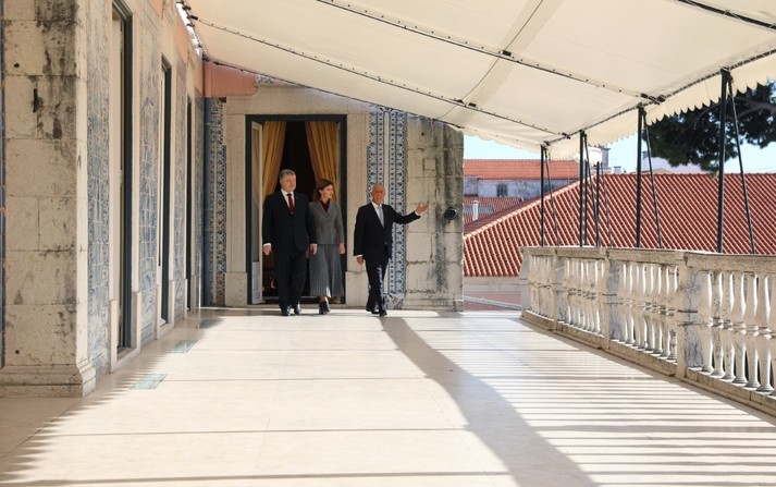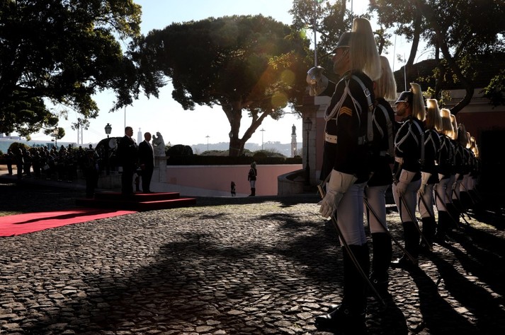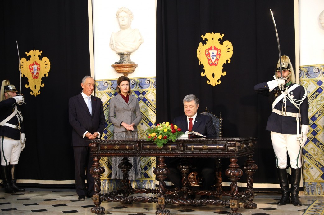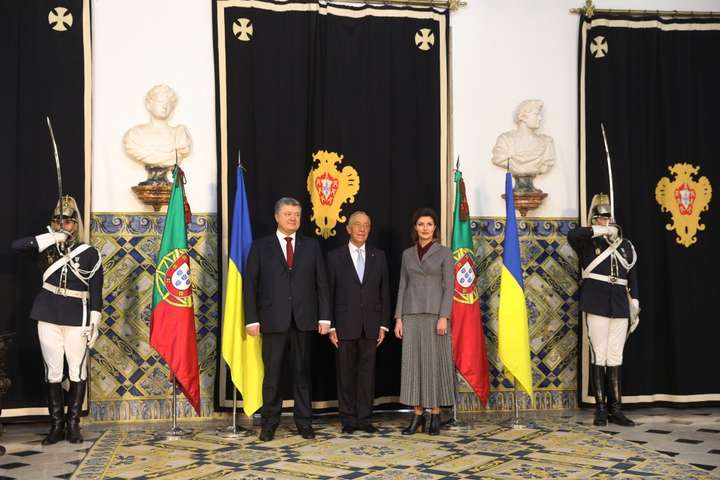 Во дворце состоялась официальная церемония встречи двух президентов, прозвучали гимны Украины и Португалии. Главы государств осмотрели строй воинов Почетного караула.