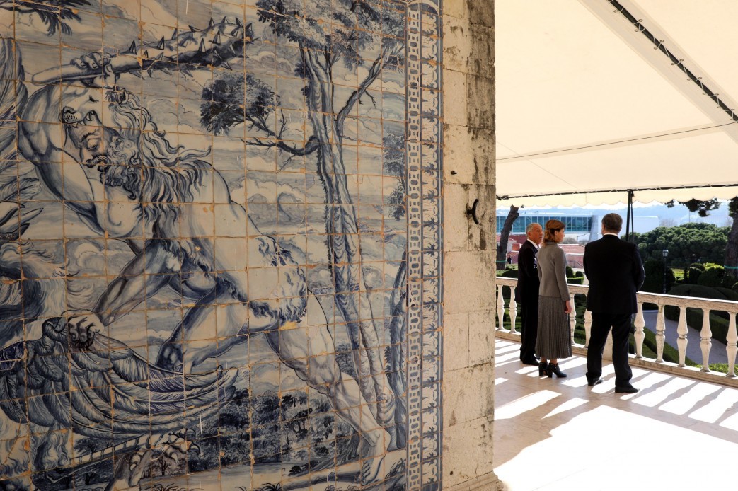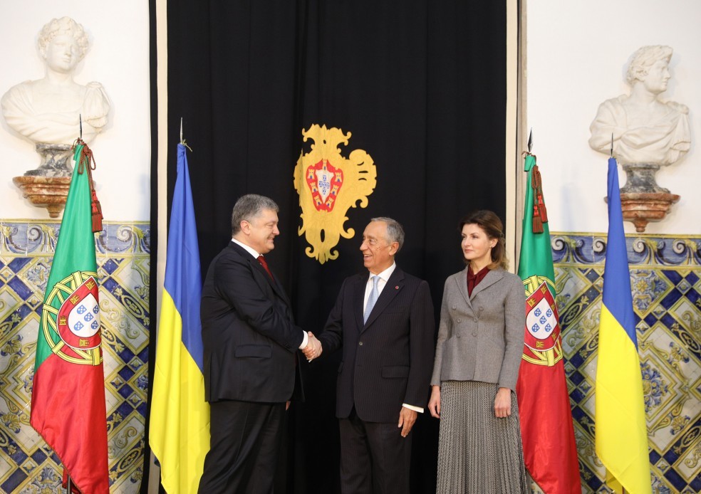 Президент Петр Порошенко вместе с супругой Мариной, которые находятся с официальным визитом в Португалии, прибыли во дворец «Белен», где их встретил президент Португалии Марсело Ребелу ди Соза.