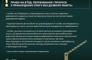 Пресс-служба ГПСУ добавила, что вдоль линии государственной границы Украины с РФ и Беларусью эти границы расширяются до 2 км на участках, предоставленных в постоянное пользование воинским частям Государственной пограничной службы для строительства, обустройства и содержания инженерно-технических и фортификационных сооружений, ограждений, пограничных знаков, пограничных просек, коммуникаций.