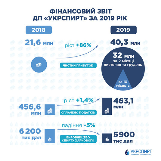 Чистая прибыль ГП «Укрспирт» в 2019 году составила 40,3 млн грн против 21,6 млн грн в 2018-м.