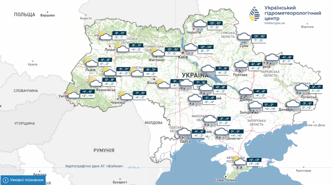 - в Киеве: Температура ночью -1°..-3°, днем +3°..+5°. Облачно с прояснениями.