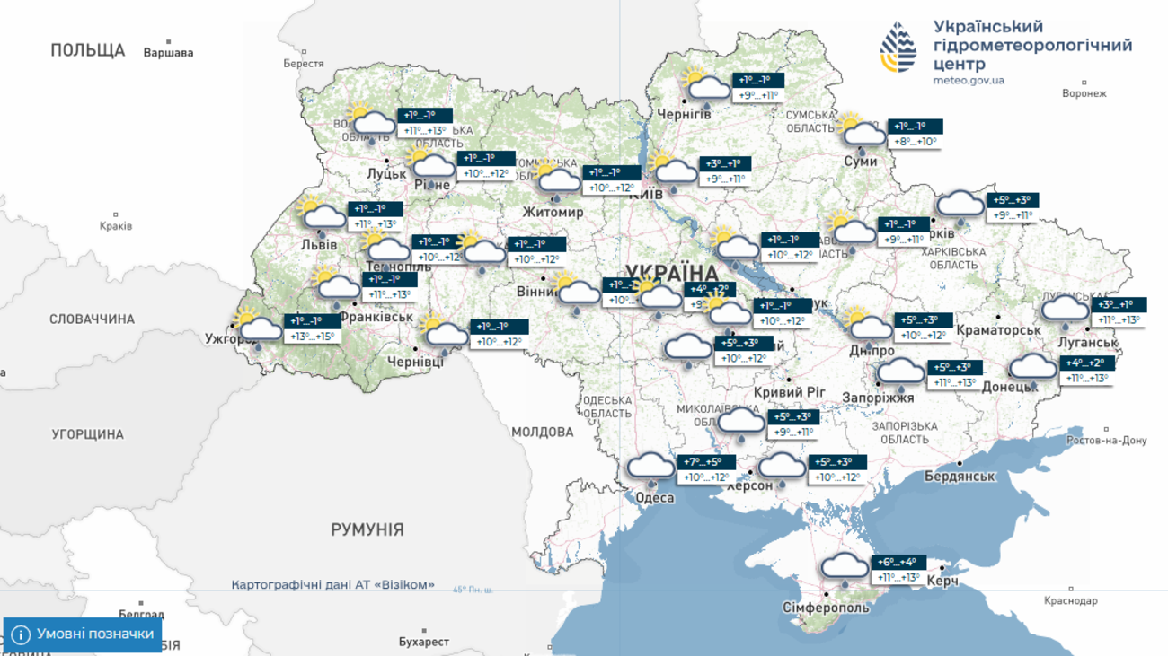 - в Киеве: Температура ночью +7°..+9°, днем +15°..+16°. Облачно с прояснениями, без существенных осадков.