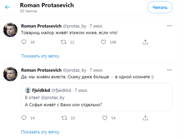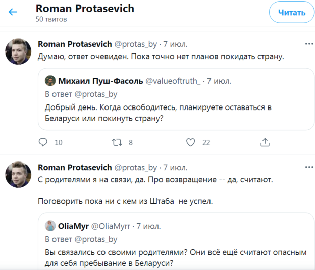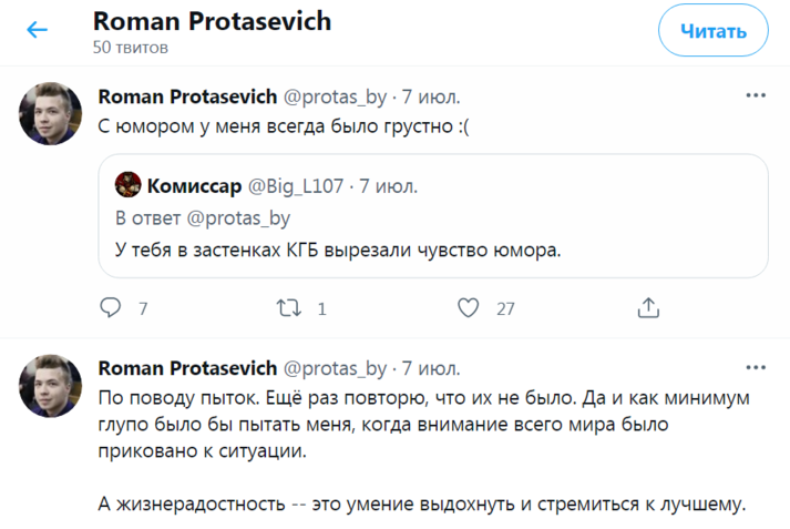 На вопрос одного из пользователей, как ему удавалось оставаться в хорошем настроении, испытывая пытки, аккаунт в Twitter под именем Протасевича возразил жестокое обращение со стороны власти во время его содержания под стражей.