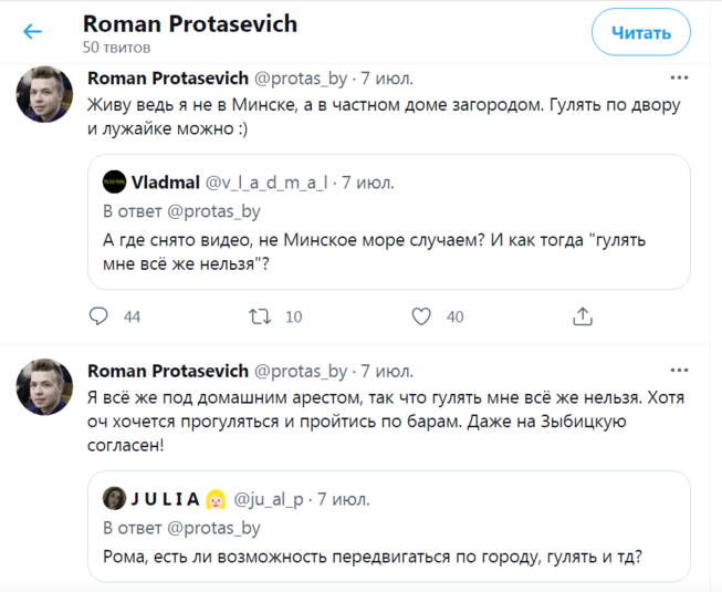 Белорусское законодательство запрещает лицам, находящимся под домашним арестом, пользоваться телефоном или интернетом, или же выходить на улицу. Поэтому непонятно кто на самом деле контролирует учетную запись Протасевича в сети Twitter.