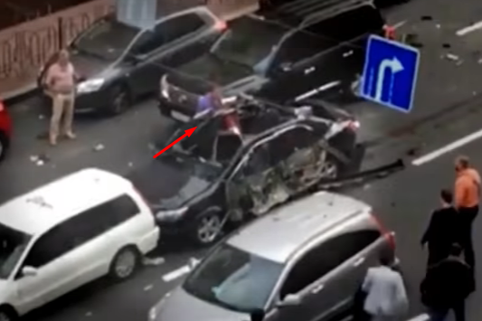 Мужчина первым выскочил из соседней машины и бросился к покореженному взрывом авто.