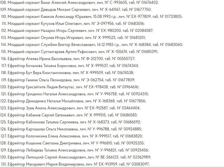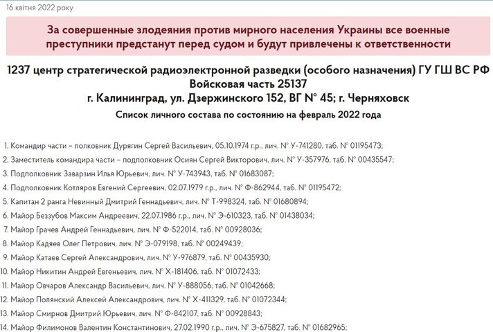 Главное управление разведки (ГУР) Министерства обороны Украины обнародовало список военнослужащих 1237 центра стратегической радиоэлектронной разведки города Калининград, совершивших военные преступления против народа Украины.