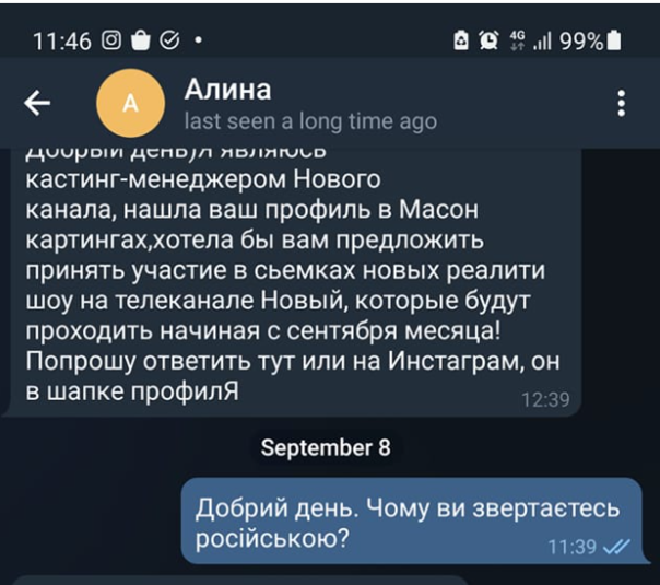 Аргументом обращения на русском языке было то, что Украина является свободной и каждый может общаться на том языке, на котором пожелает. К тому же, в пример она привела Германию. В конце концов, диалог закончился тем, что кастинг-менеджер обругала девушку. Также представитель медиа просила отправлять интимные фото и представлялась не только менеджером канала, но и администратором чата с кастингом в Telegram.