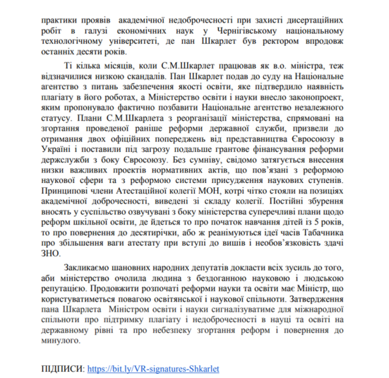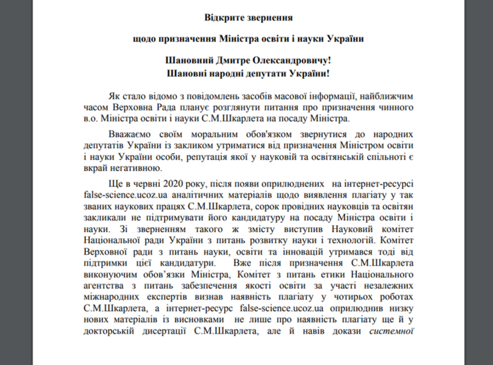 «Как стало известно из сообщений средств массовой информации, в ближайшее время Верховная Рада планирует рассмотреть вопрос о назначении действующего и.о. Министра образования и науки С. М. Шкарлета на должность министра. Считаем своим моральным долгом обратиться к народным депутатам Украины с призывом воздержаться от назначения Министром образования и науки Украины лица, репутация которого в научной и образовательной общественности является крайне негативной», – говорится в сообщении.