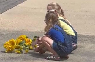 Две девочки принесли цветы к зданию посольства страны-террориста
