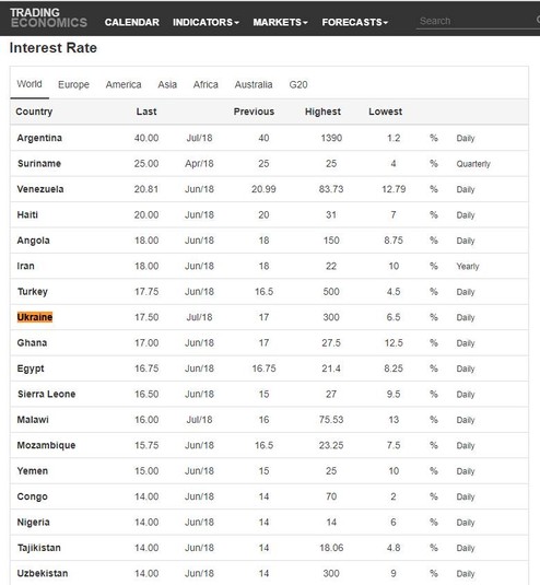 Украина обошла Гану в рейтинге стран с самыми высокими учетными ставками. Об этом свидетельствует рейтинг, опубликованный Trading Economics.