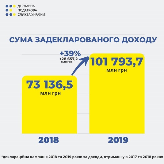 В течение 2019 года гражданами Украины были задекларированы годовые доходы (за 2018 год) на 101,8 миллиардов гривен. Об этом сообщается на официальном сайте Государственной налоговой службы.