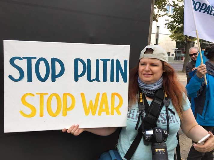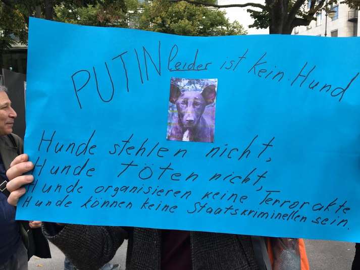 Участники митинга принесли с собой плакаты на российском, немецком и английском языках. В частности, среди надписей были «Путин не собака?», «Stop Putin, stop war».