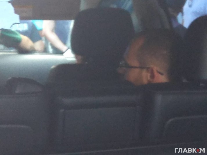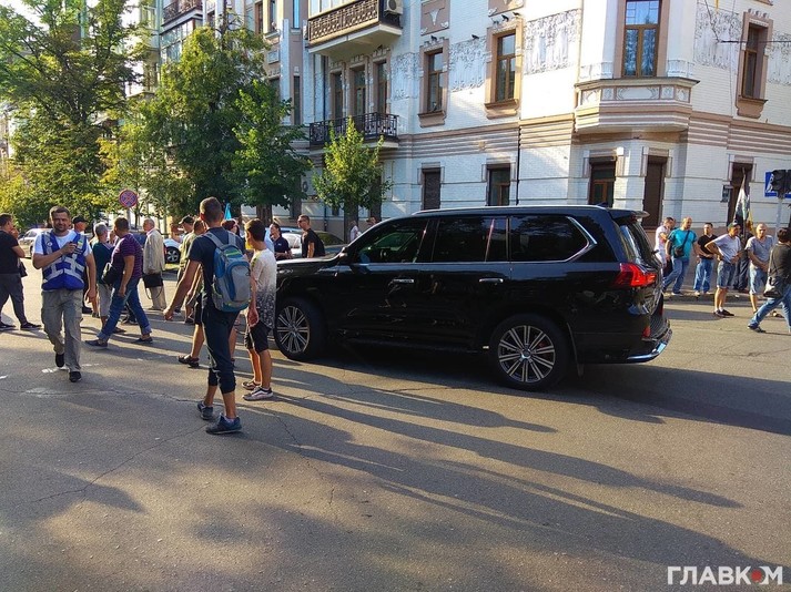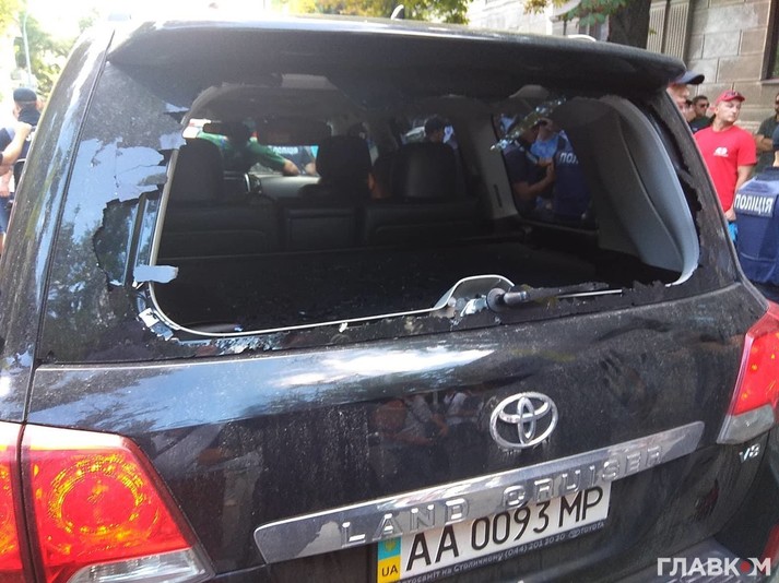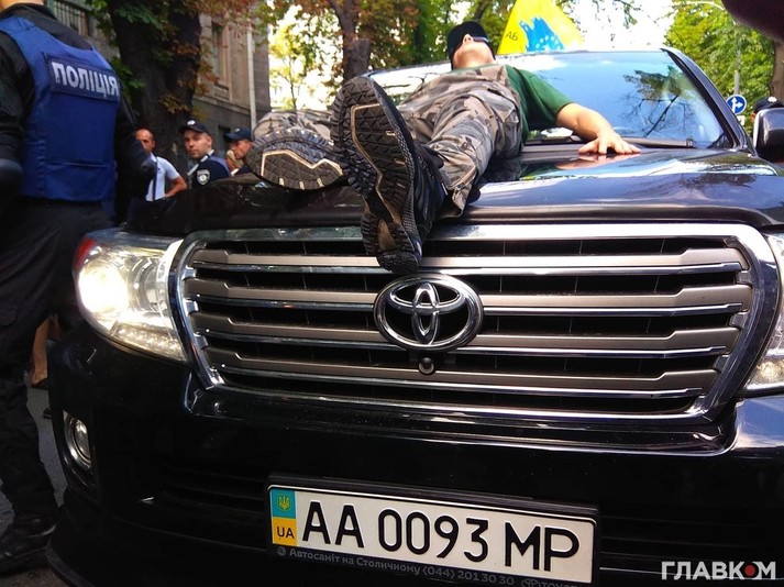 Корреспондент «Главкома» сообщает, что в авто находится народный депутат Павел Пинзеник. Протестующие взяли его в осаду и камнем разбили заднее окно джипа. По их словам, нардеп хотел убежать.