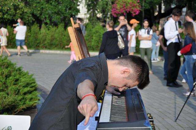 В центре Киева Ярослав Олийнык, сын убитого в столице бойца АТО Сергея Олийныка, дал концерт на синтезаторе в честь отца.