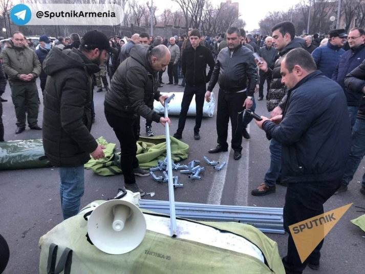 Оппозиция Армении устанавливает палатки на центральном проспекте Баграмяна в Ереване под стенами парламента.