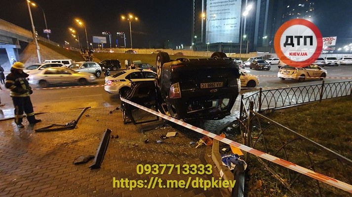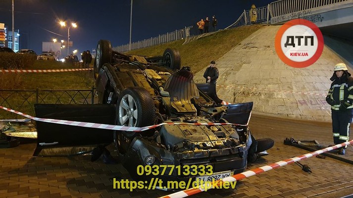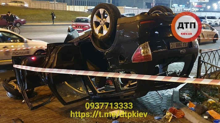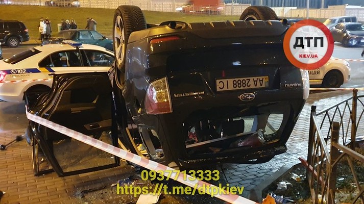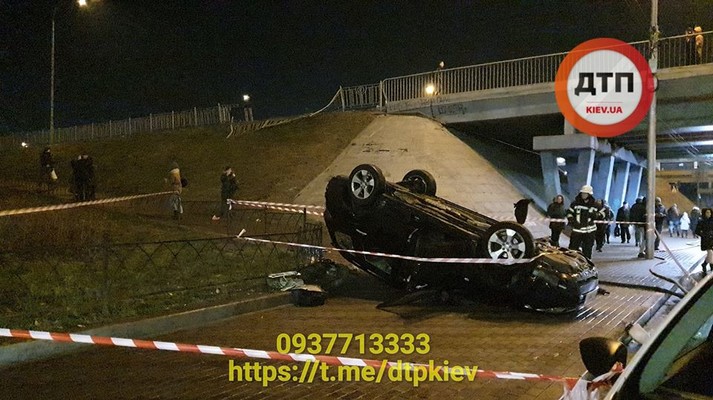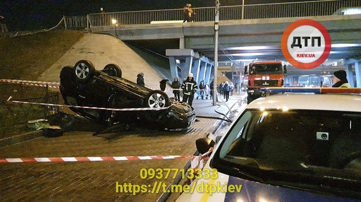 В столице возле станции метро «Левобережная» автомобиль Subaru упал с моста на тротуар.