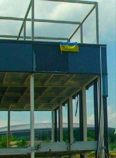 «Место размещения флага интересно еще и тем, что до гостиницы «Виктория» (где живет целое кодло русских оккупантов) примерно 200 метров. К «Донбасс-Арене» - примерно 500 метров», - сообщил Овчаренко.