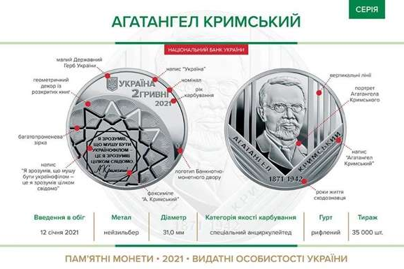 Нацбанк Украины со вторника, 12 января, вводит в обращение новую памятную монету. Она посвящена украинскому историку, слависту, языковеду, востоковеду, писателю, переводчику, одному из основателей Украинской Академии наук – Агафангелу Крымскому, сообщает пресс-служба НБУ.