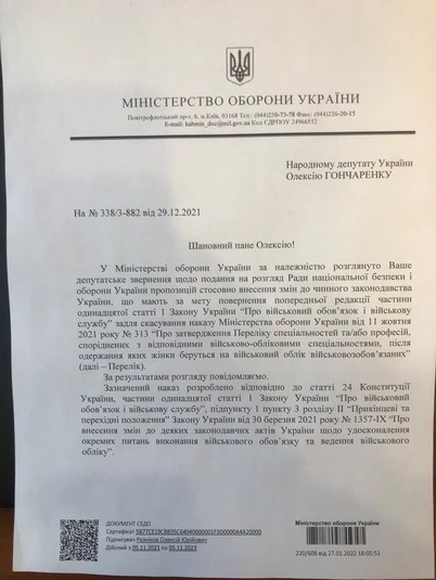 Минобороны сокращает количество профессий женщин, поддерживающих под обязательным военным учетом. В ответе Министерства обороны на депутатский запрос Алексея Гончаренко указывается, что определены наиболее востребованные профессии в 13 профессиональных отраслях.