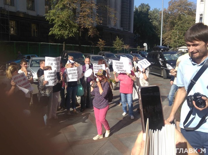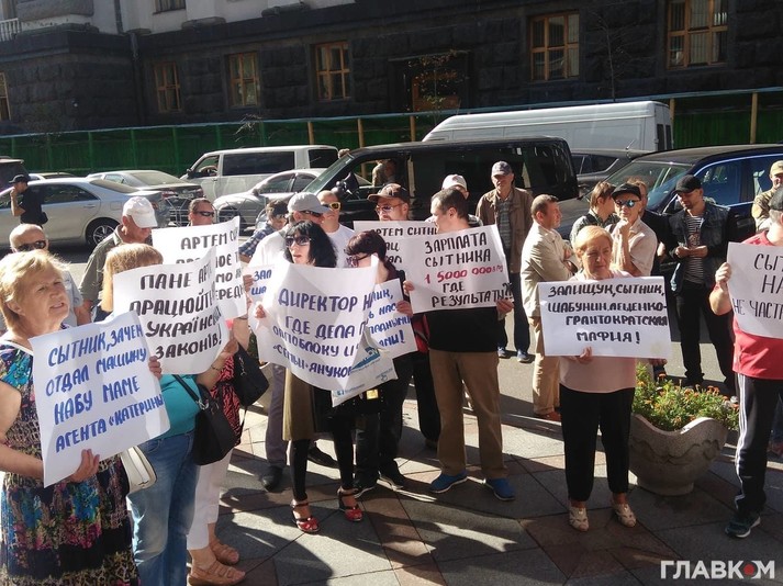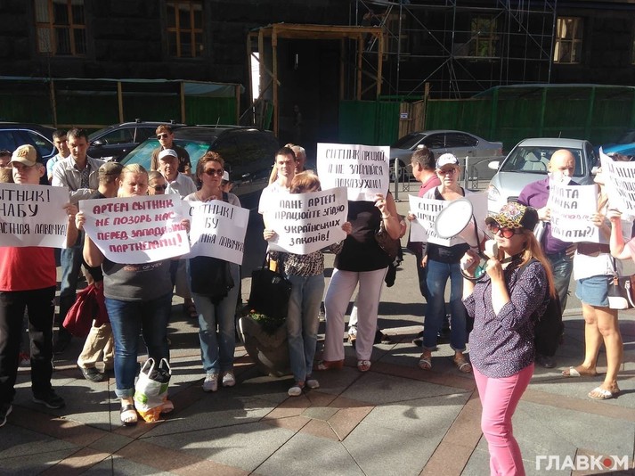 Участники акции держат в руках плакаты, в частности «Артем Сытник, не позорь нас перед западными партнерами», «Господин Артем, работайте согласно украинским законам», «Сытный, работай, а не занимайся показухой» и др.