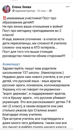 Все началось из сообщения в социальной сети, где одна из мам рассказала, что их 7-8 летним детям рассказывают о войне на Донбассе, о преступлениях Сталина. Но больше всего их возмутил настрой детей против русскоязычных людей, потому что по определению учительницы – это враги.