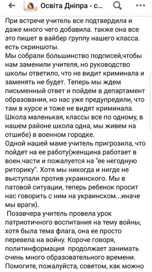 «Что учитель говорит неправильно? Кто будет отрицать, что у нас седьмой год идет война? На востоке до сих пор стреляют и гибнут герои. То, что преподаватель прививает любовь к украинскому языку, я считаю, это плюс», – рассказывает директор школы Ирина Гайдар в комментарии изданию.