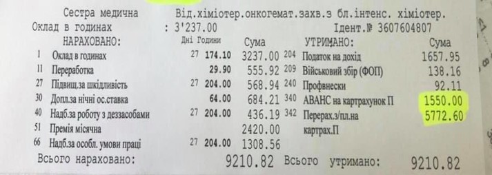 Казалось бы, после визита президента и главы МОЗ Степанова, во время которого было озвучено много заботливых обещаний о пациентах и врачах там все должно было быть прекрасно. Но врачи и медсестры 59 отделений получили на руки зарплату от 3,5 до 8 тысяч гривен. Вдвое меньше, чем в июне. И это впервые за много лет, – написала на Facebook странице экс-нардеп Оксана Корчинская.