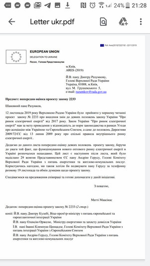 Нет целесообразности в закреплении ценовых ограничений на рынке электроэнергии, предлагаемых Законопроектом «О внесении некоторых изменений в Закон «О рынке электрической энергии» (№ 2233). Об этом идет речь в письме главы Представительства Евросоюза в Украине Матти Маасикаса председателю Верховной Рады Украины Дмитрию Разумкову, которое опубликовала нардеп от «Европейской солидарности», глава парламентского комитета по вопросам интеграции Украины с Европейским союзом Иванна Климпуш-Цинцадзе.