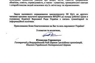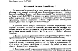 «По итогам встречи с членами ВСЦиРО сегодня я получил письмо, где значится, что церкви и религиозные организации поддерживают рассмотрение в Украинском парламенте и принятие за основу указанного документа. И этим они все признают, что эти отношения должны быть нормированы законодательно», – сообщил председатель ВР.