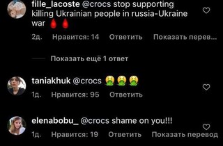 Также в комментариях пишут, что Crocs зарабатывает на крови украинских детей.