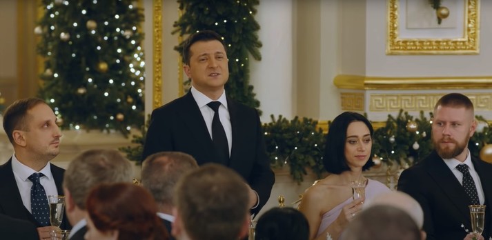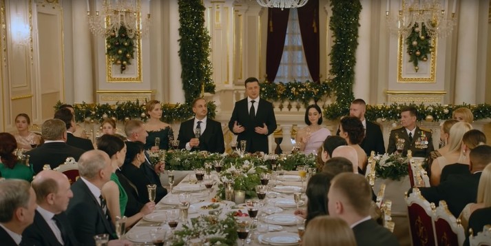 Напомним, 22-минутный видеоролик, во время которого президент произносит праздничное обращение, был снят в формате застолья. За столом у президента собрались известные люди, перед которыми Зеленский произносит речь.